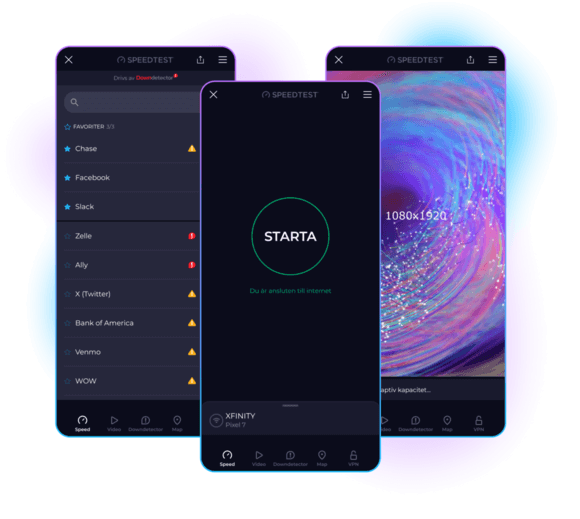Genom att använda Downdetector i appen Speedtest kan du enkelt felsöka anslutningsproblem för att avgöra om problemet beror på din internetanslutning eller en tredjepartstjänst. Med Downdetector kan du: